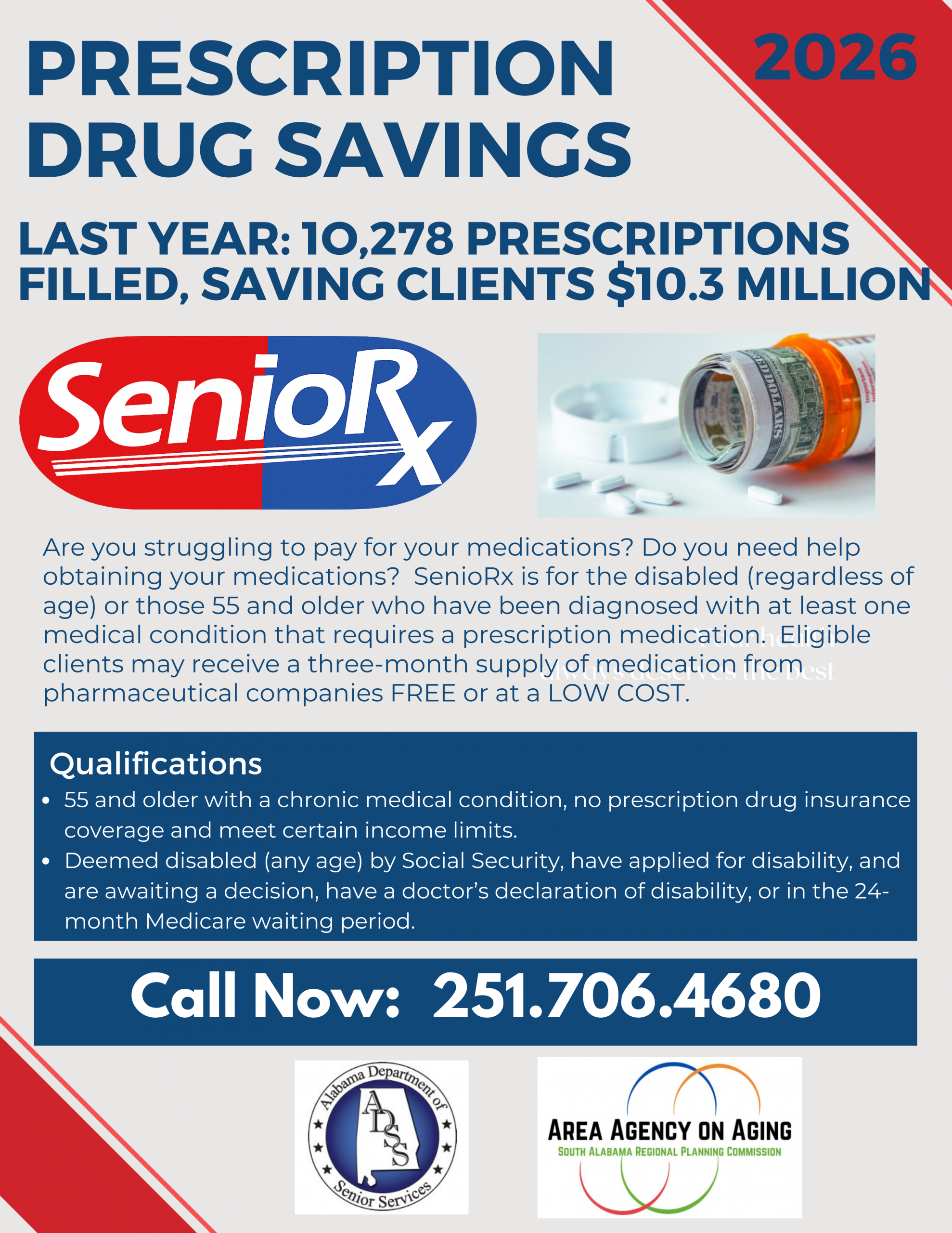 SenioRx can help with the high cost of prescription drugs. The program serves people age 55 or older, and any person, regardless of age, who has applied for Social Security Disability. Clients are enrolled in patient assistance programs that can supply free, brand-name medications. We also link many clients to low-cost, non-profit, mail order companies for generic medications.